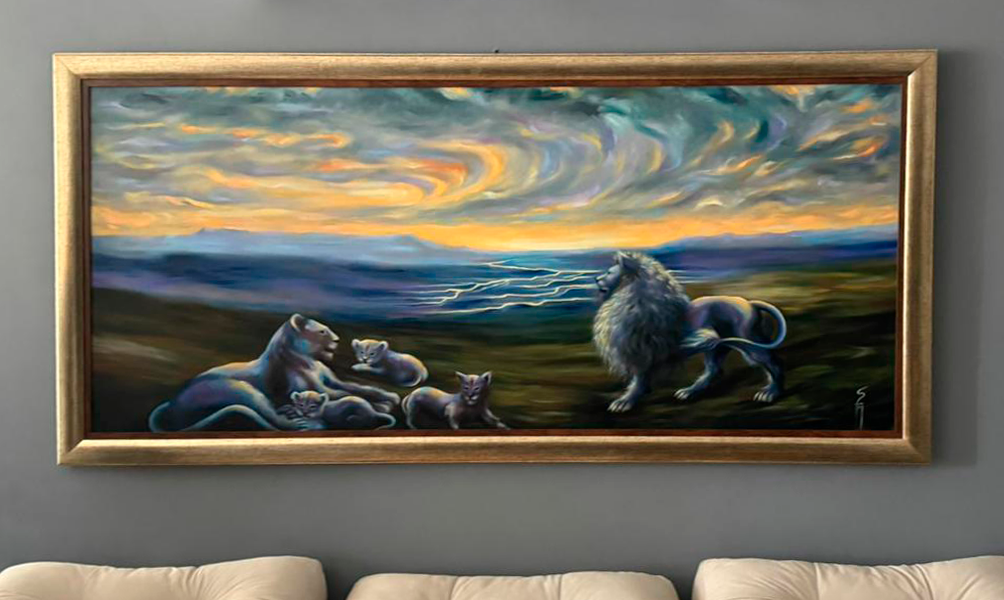 Após a aprovação do estudo digital, damos início a pintura em tela: o processo dura em torno de 4-6 semanas. Você receberá atualizações das etapas principais até a finalização.