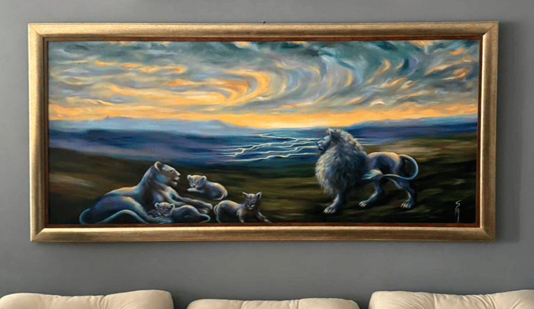 Sua nova pintura personalizada será revelada. Antes que ela possa sair do estúdio e ir para sua casa, precisará de mais 3 a 4 semanas para curar antes de receber o verniz.