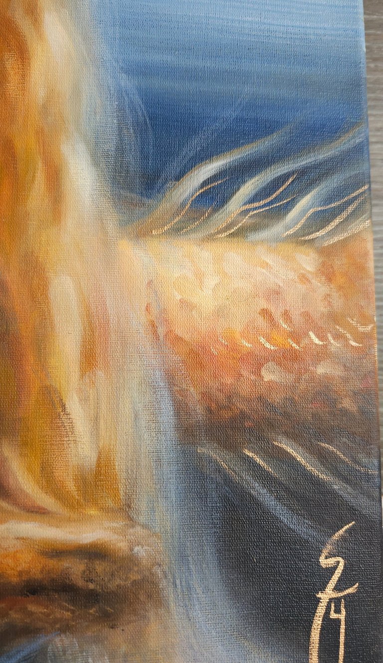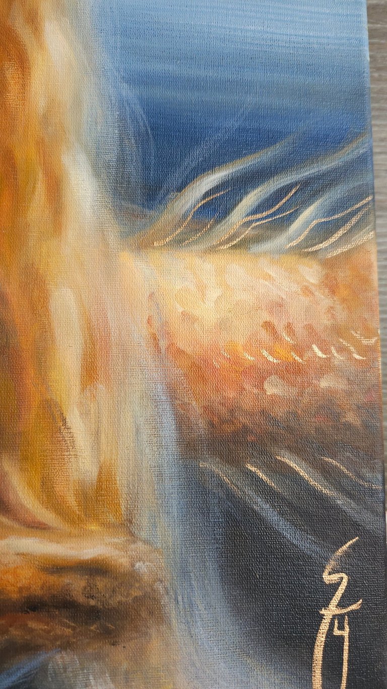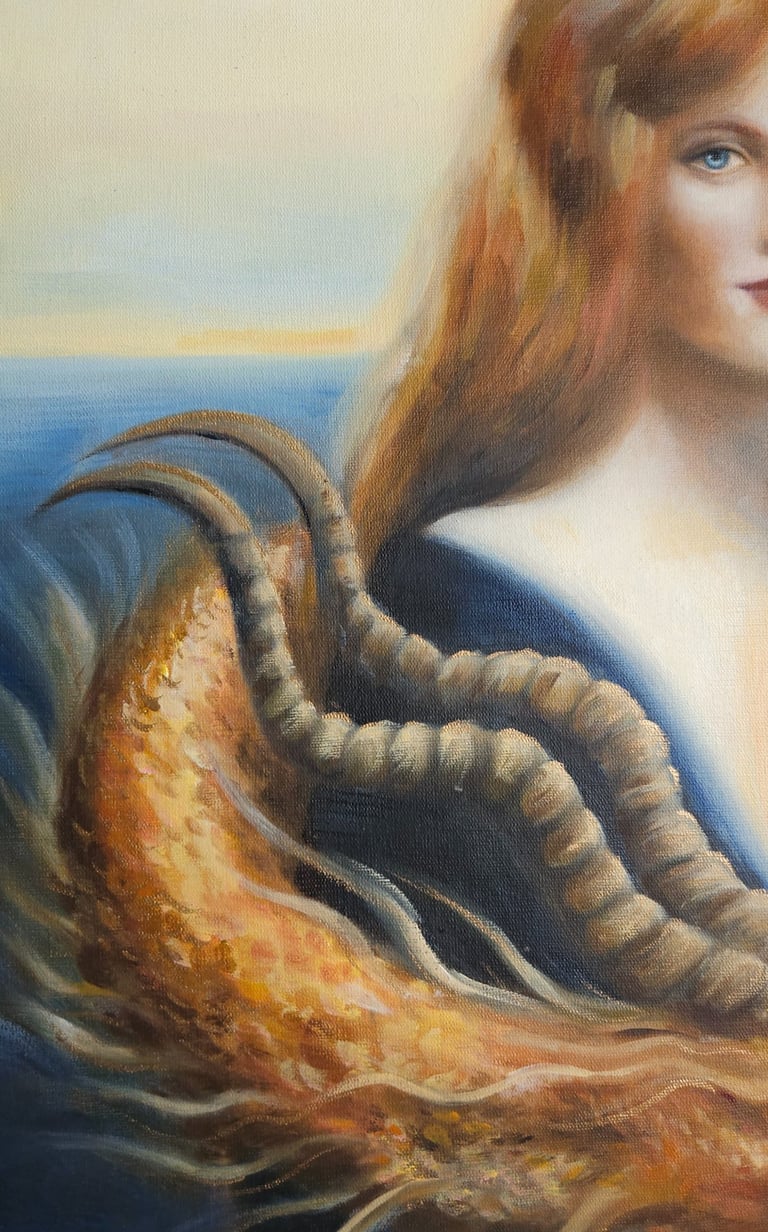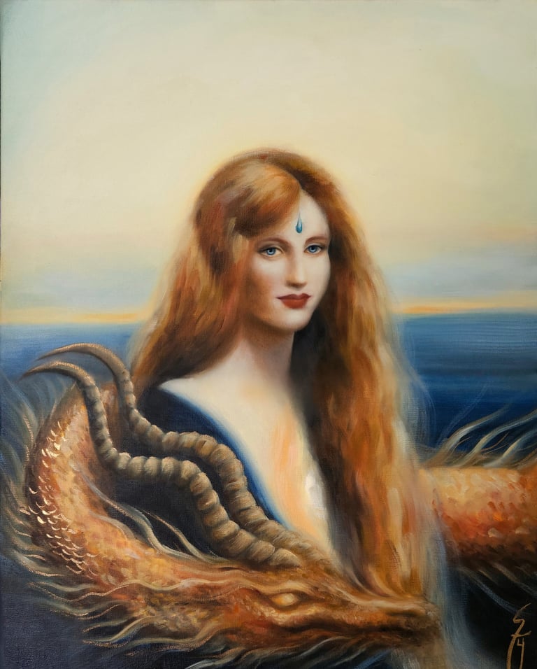 Guardião do inconsciente luminoso faz parte de uma série sobre o desvendamento dos mistérios interiores do feminino, sempre associando uma figura arquetípica feminina ao simbolismo do dragão. A artista costuma pintar dragões quando deseja retratar o “animus”, principio masculino presente em toda mulher, que atua como uma força inconsciente que protege a sacralidade da alma feminina. Quando o animus está saudável, ele concede força interior, clareza de pensamento, espírito de autoridade e coragem, voz interior que orienta para a verdade, e o impulso para a ação. Nesta pintura, um dragão dourado serpenteia em volta de uma donzela de feições enigmáticas, como se guardasse o mistério de seu coração pulsante, brilhante, representando as partes mais luminosas da alma que desejam transbordar pelo centro cardíaco. O dragão guarda o tesouro (a alma luminosa da mulher), representando o principio mítico que faz a ponte entre seu ego e o seu Self (essência). Essa pintura retrata uma jornada arquetípica feminina, representando o momento em que heroína rompe com padrões sociais pré-estabelecidos para encontrar um senso mais verdadeiro de si (seja rompendo com padrões sociais familiares, profissionais ou culturais.). É neste ponto da jornada que a heroína compreende que precisa primeiro fortalecer-se em si, para que sacrifícios vãos não ocorram, protegendo assim sua verdadeira essência luminosa. Diferente da jornada de evolução espiritual do homem — que, simbolicamente, costuma envolver o aprendizado de cuidar, nutrir e acolher (aspectos que são raramente incentivados a integração), a evolução espiritual da mulher pede a construção de um ego saudável, um senso legítimo de valor e de soberania. Neste processo ela deixa de ofertar seus tesouros indiscriminadamente (esvaziando-se) e passa a cultivar seus dons para si, tornando-se o altar, e não mais o sacrifício. Só então, ela é capaz de encontrar o seu modo particular de servir, sem dar brechas para explorações predatórias - sendo vital o desenvolvimento de uma força masculina saudável e integrada, conquistadora e resoluta (aspectos frequentemente podados na criação das meninas) auxiliando na proteção de seus interesses ao preservar seus talentos e sua criatividade, colocando seus dons no mundo com assertividade e combatendo a fraqueza de espirito.