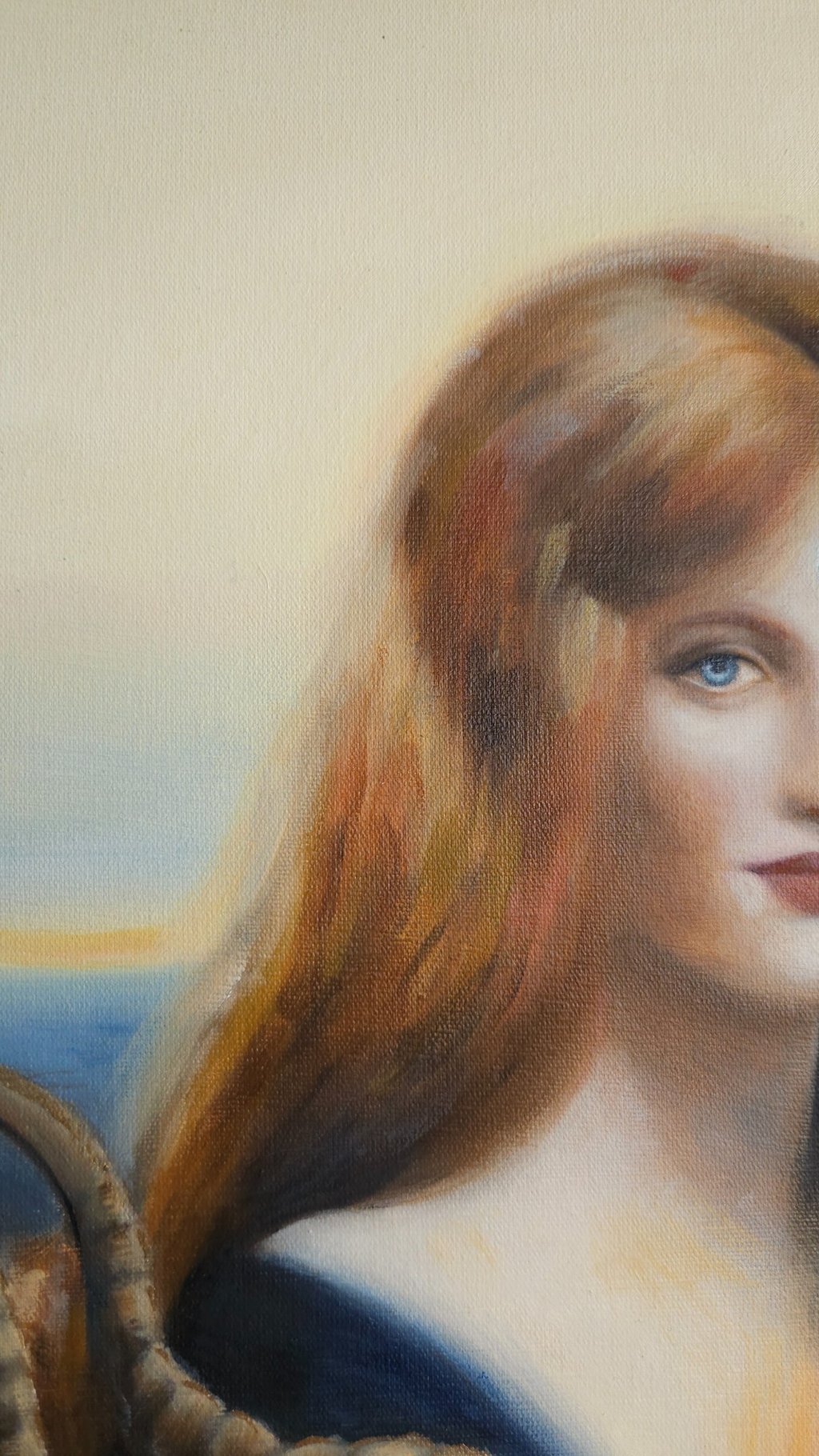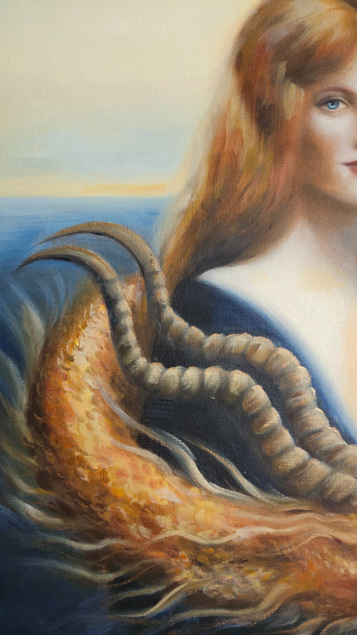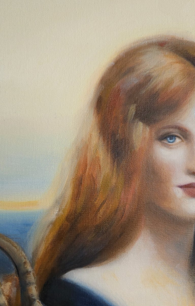 Guardião do inconsciente luminoso faz parte de uma série sobre o desvendamento dos mistérios interiores do feminino, sempre associando uma figura arquetípica feminina ao simbolismo do dragão. A artista costuma pintar dragões quando deseja retratar o “animus”, principio masculino presente em toda mulher, que atua como uma força inconsciente que protege a sacralidade da alma feminina. Quando o animus está saudável, ele concede força interior, clareza de pensamento, espírito de autoridade e coragem, voz interior que orienta para a verdade, e o impulso para a ação. Nesta pintura, um dragão dourado serpenteia em volta de uma donzela de feições enigmáticas, como se guardasse o mistério de seu coração pulsante, brilhante, representando as partes mais luminosas da alma que desejam transbordar pelo centro cardíaco. O dragão guarda o tesouro (a alma luminosa da mulher), representando o principio mítico que faz a ponte entre seu ego e o seu Self (essência). Essa pintura retrata uma jornada arquetípica feminina, representando o momento em que heroína rompe com padrões sociais pré-estabelecidos para encontrar um senso mais verdadeiro de si (seja rompendo com padrões sociais familiares, profissionais ou culturais.). É neste ponto da jornada que a heroína compreende que precisa primeiro fortalecer-se em si, para que sacrifícios vãos não ocorram, protegendo assim sua verdadeira essência luminosa. Diferente da jornada de evolução espiritual do homem — que, simbolicamente, costuma envolver o aprendizado de cuidar, nutrir e acolher (aspectos que são raramente incentivados a integração), a evolução espiritual da mulher pede a construção de um ego saudável, um senso legítimo de valor e de soberania. Neste processo ela deixa de ofertar seus tesouros indiscriminadamente (esvaziando-se) e passa a cultivar seus dons para si, tornando-se o altar, e não mais o sacrifício. Só então, ela é capaz de encontrar o seu modo particular de servir, sem dar brechas para explorações predatórias - sendo vital o desenvolvimento de uma força masculina saudável e integrada, conquistadora e resoluta (aspectos frequentemente podados na criação das meninas) auxiliando na proteção de seus interesses ao preservar seus talentos e sua criatividade, colocando seus dons no mundo com assertividade e combatendo a fraqueza de espirito.