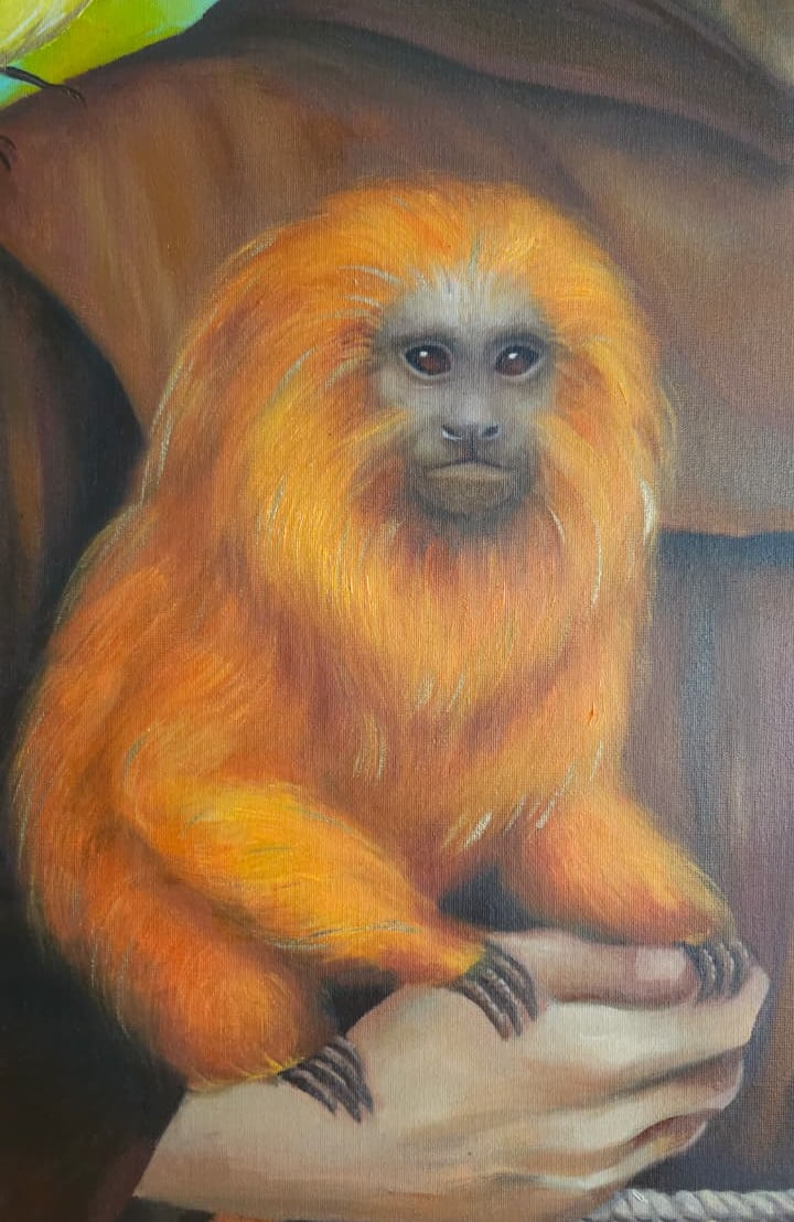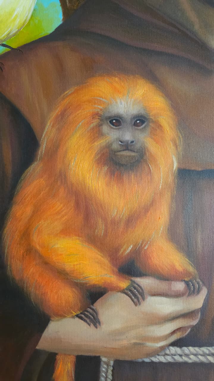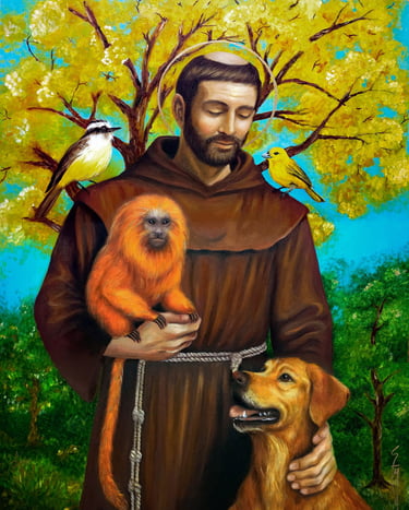 Sob a luz suave que atravessa a folhagem do ipê-amarelo, São Francisco de Assis volta seu olhar: não para o céu, mas para a terra. Em seus braços repousa o mico-leão-dourado, delicado e vibrante como a própria respiração da floresta.