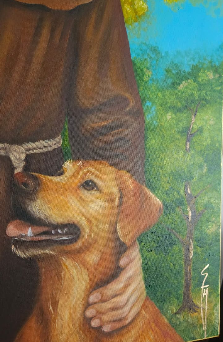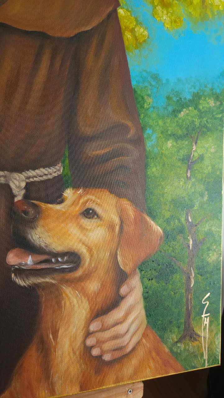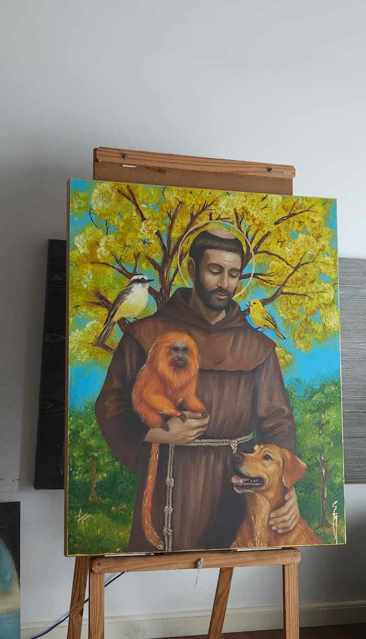 Nos ombros, o bem-te-vi e o canário celebram a alegria do instante, enquanto aos seus pés o cachorro caramelo se aproxima, trazendo consigo a doçura daqueles que esperam apenas um gesto de amor. A auréola dourada, sutil como um fio de luz ao amanhecer, corre pelos veios da mata, estendendo-se aos pelos e às penas dos animais. Esse mesmo ouro que toca o santo e a criatura cintila como o brilho do sol — correspondendo à força sagrada e luminosa da natureza, nos lembrando de que aquilo que vibra na luz e que aquece o mundo é a mesma energia que pulsa no que vive e sente, fazendo a ponte entre o sagrado e o terreno, os santos e as criaturas, o céu e a terra.