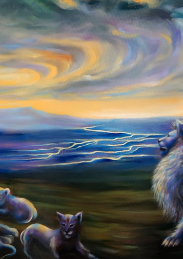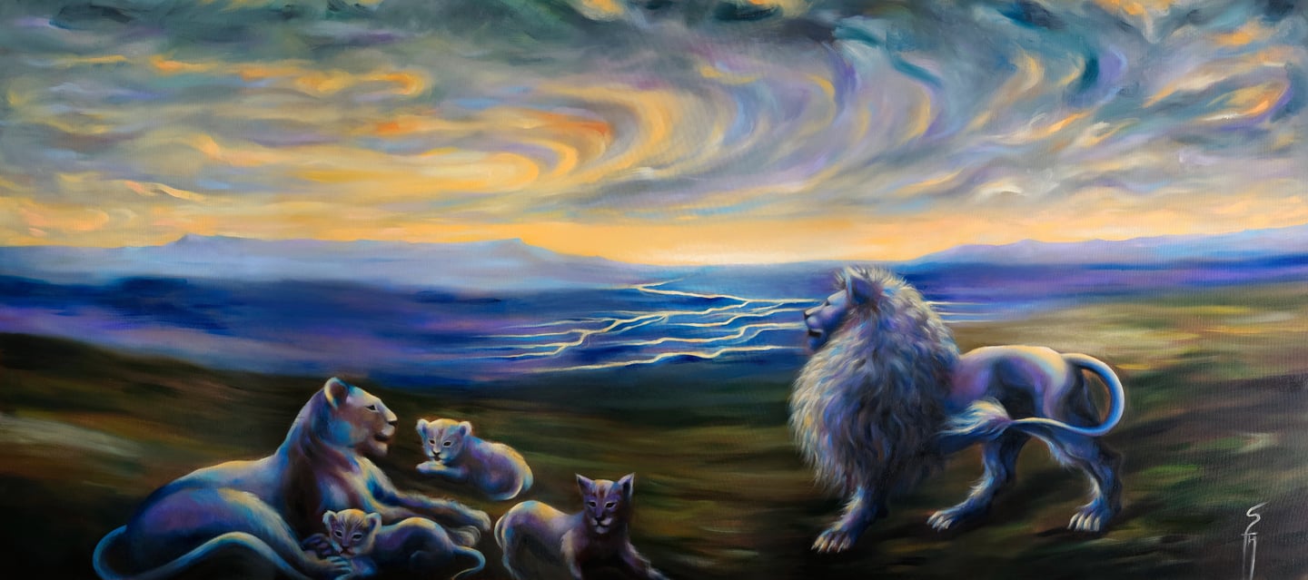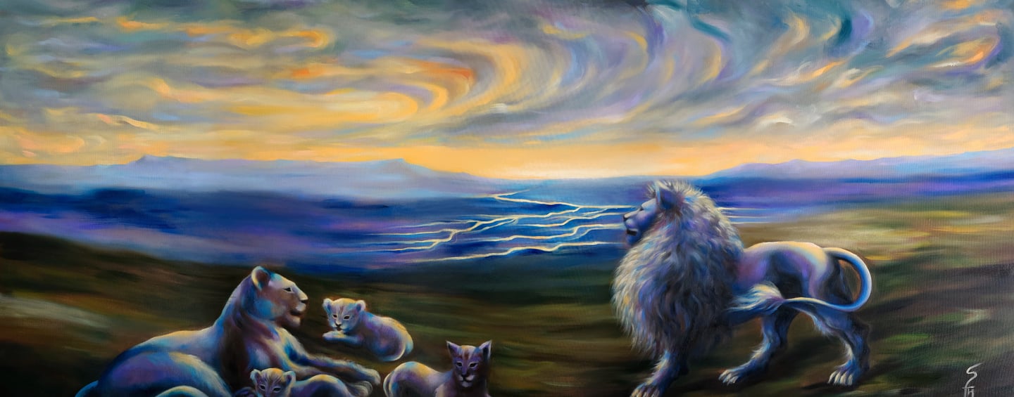 “Leões azuis contemplando o horizonte”, 2025 | óleo sobre tela, 180 x 80 cm.